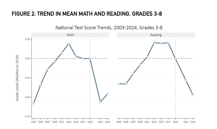 On the heels of the grim NAEP results covered in our last newsletter, the multi-institutional Education Recovery Scorecard team released a new report tracking district-level recovery through spring 2024 and found similarly negative results. Just 11% of students in third through eighth grades are enrolled in a district where average reading levels exceed pre-pandemic levels (that figure is 17% for math), and recovery in low-income districts continues to progress more slowly and modestly than recovery in higher-income districts.
